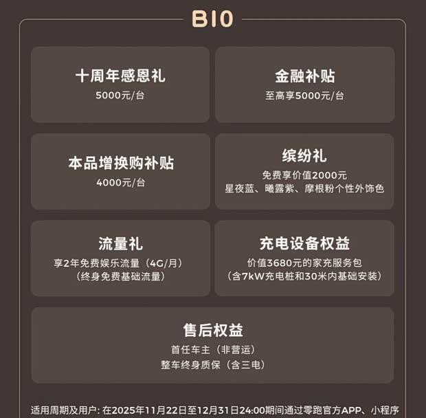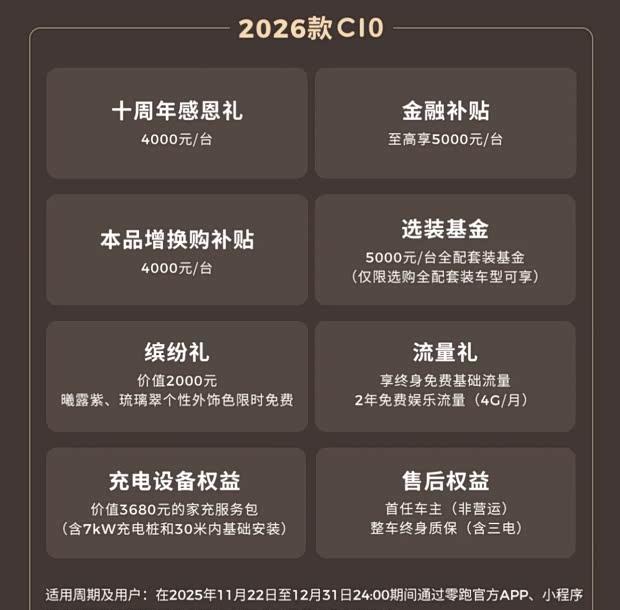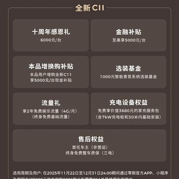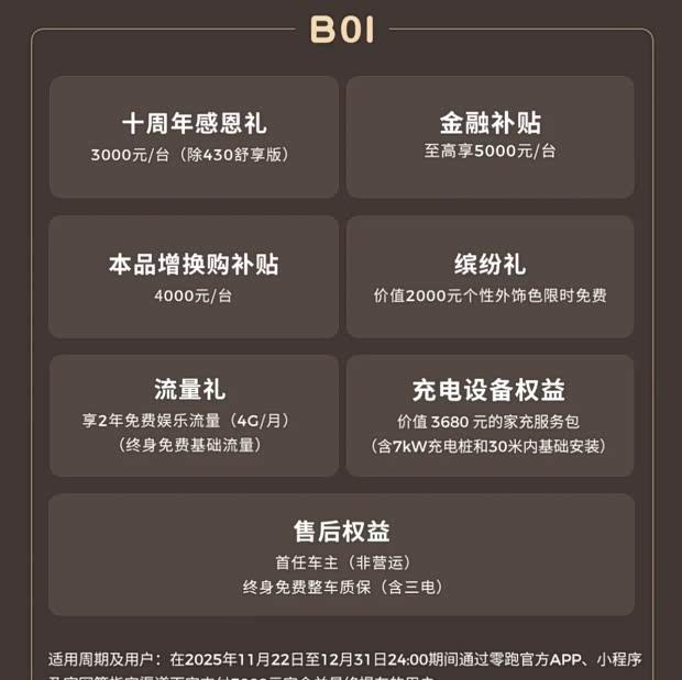 B01与B10分别提供3000元与5000元现金优惠,均享有最高5000元金融补贴及4000元本品增换购支持,个性外饰颜色限时免费。C11优惠力度为6000元现金,金融补贴最高5000元,本品增换购补贴5000元,另赠1000元香氛系统选装基金。