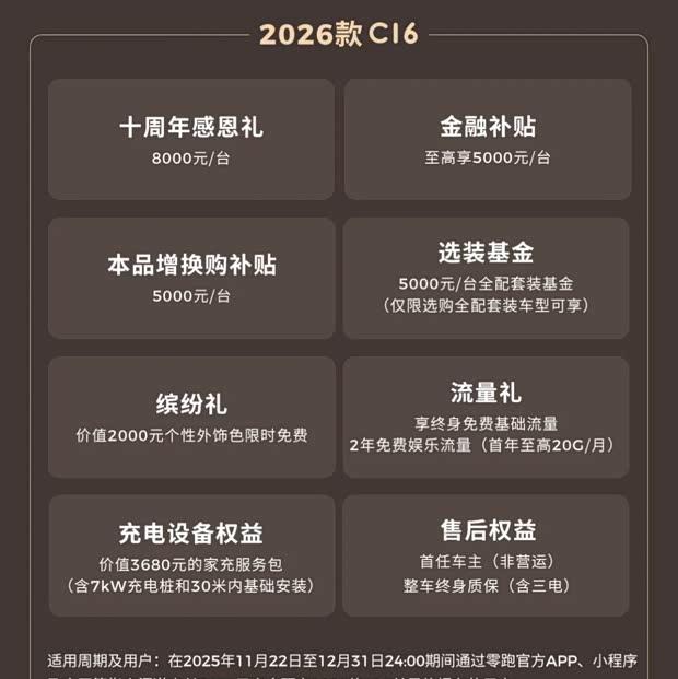 C16车型现金优惠达8000元,可享最高5000元金融补贴与5000元本品增换购补贴,同时提供5000元选装基金,个性外饰颜色限时免费。C10现金优惠4000元,金融补贴最高5000元,本品增换购补贴4000元,并赠送5000元选装基金,外饰颜色同样限时免费。