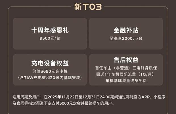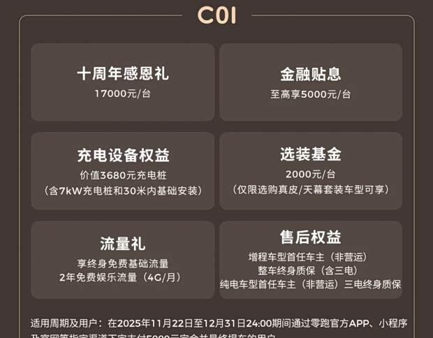 T03享有9500元现金优惠,金融补贴最高2000元。C01优惠幅度最大,现金直降17000元,金融补贴最高5000元,并附赠2000元选装基金。